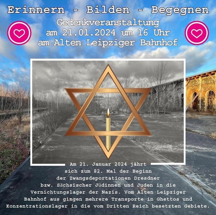Anlässlich des 82. Jahrestages des Beginns der Zwangsdeportation von Jüdinnen und Juden aus Dresden und Sachsen laden wir zu einer Gedenkstunde auf dem Gelände des Alten Leipziger Bahnhofs ein.