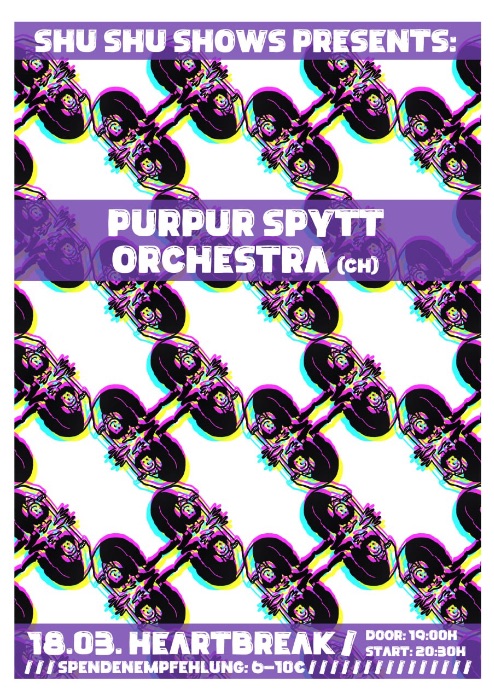 Purpur Spytt is a one-woman band by Charlotte Mermoud from Geneva. You might know her from THE STACHES or MARAUDEUR. This time she‘ll be here with full band as PURPUR SPYTT ORCHESTRA. They play some (no-)wavy pop-ish post-punk with hypnotic Bass Lines. Her lyrics Are Ironic, not to say satirical. Some might compare it with SNEAKS, ESG, LIZZY MERCIER DESCLOUX or DELTA5. We say you better Dance and fill the hat.